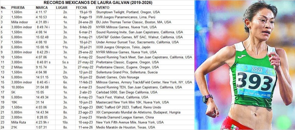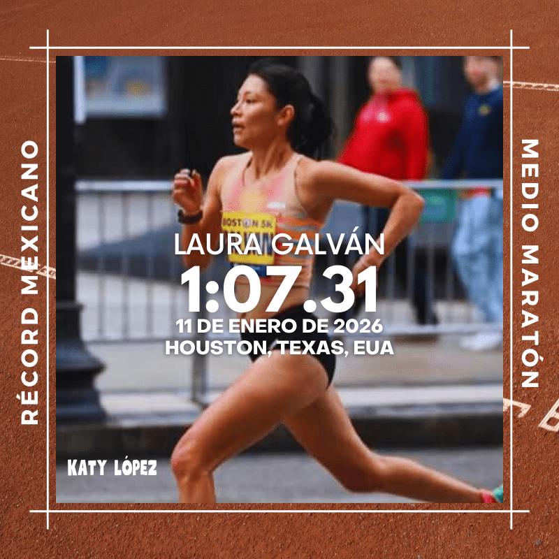 La fondista olímpica Laura Galván ha roto una marca que tenía 23 años vigente, al mejorar el Récord Mexicano de Medio Maratón, luego de cruzar la meta en 8º sitio en el 21k de Houston, con un crono de 1:07.31 horas y ser la mejor representante de América Latina en la competencia.